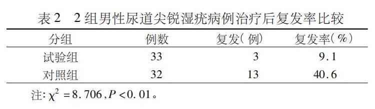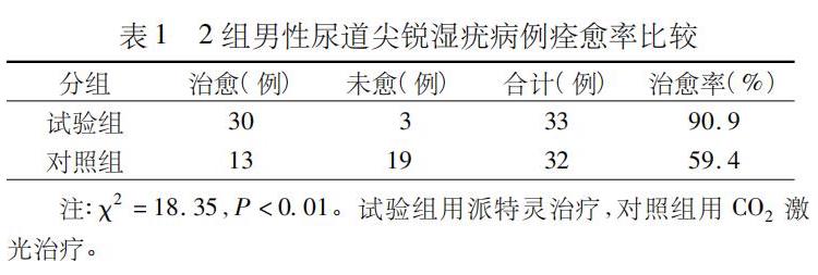 將65例男性尿道尖銳濕疣患者隨機(jī)分成派特靈治療試驗(yàn)組(33例)和CO2激光治療對(duì)照組(32例),隨訪3個(gè)月,比較2組的治愈率、復(fù)發(fā)率和不良反應(yīng)。